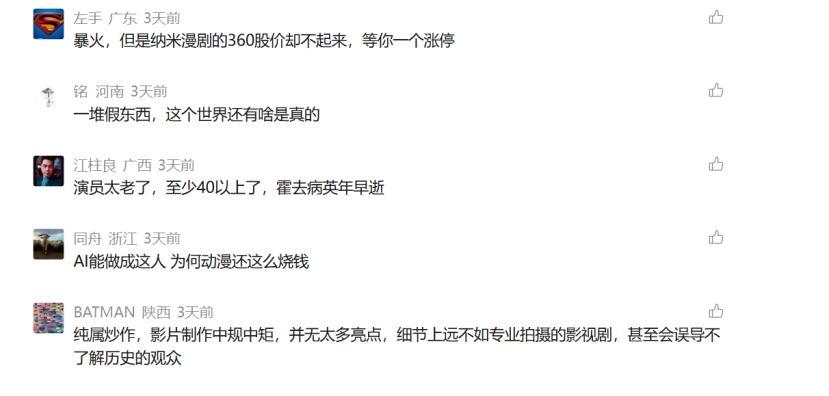 网友指出,历史上霍去病去世年仅24岁,但短剧中的形象过于老成;此外,出现的“马镫”道具并非汉代产物,团队的内容专业性欠缺。
